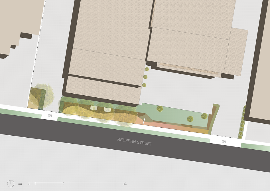 The curvature of the design creates a harmonious flow for the viewers eye line between the soft leafed grasses and the sharp form of the Lomandra Longifolia. By mounding the landscape along the Redfern Street fence line, it provids privacy for employees using the space, as well as directing the eye line of passing traffic, to the newly constructed glass facade of the factory.